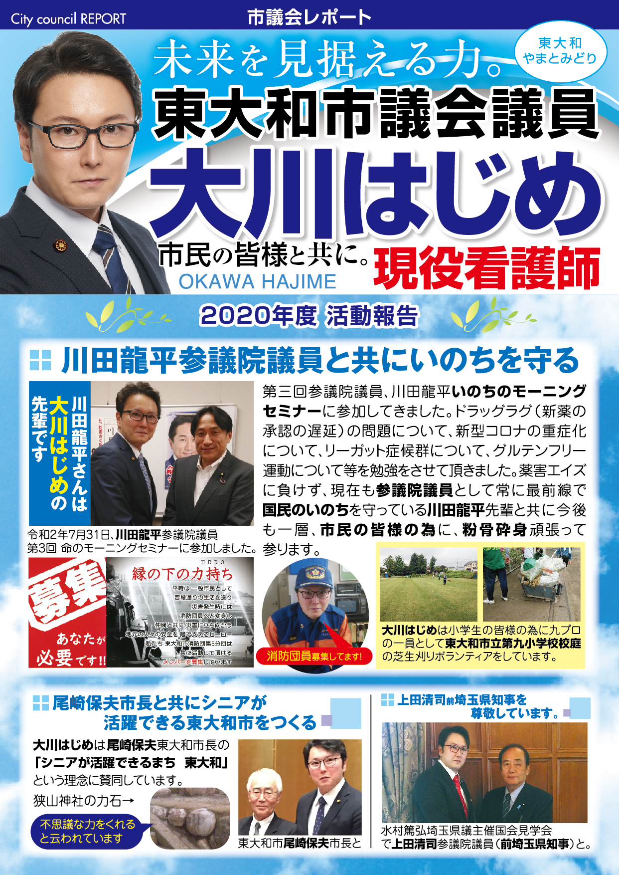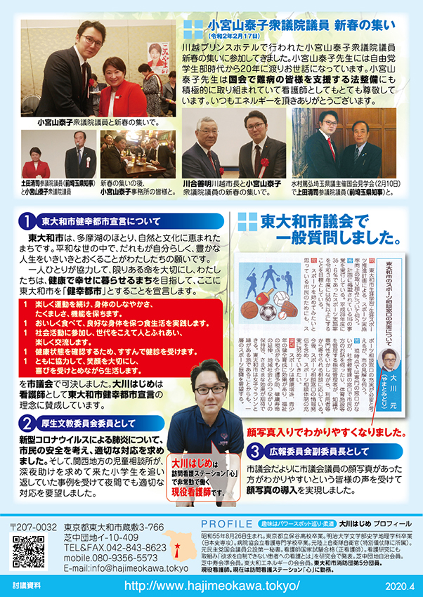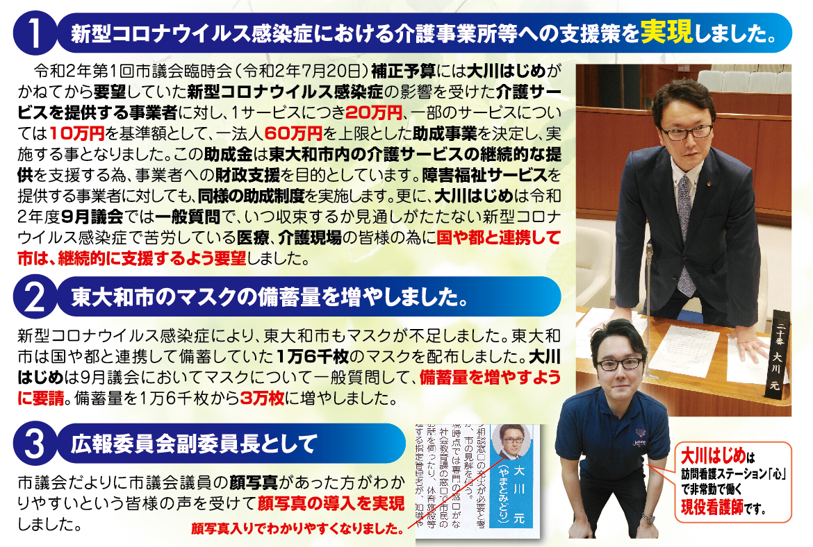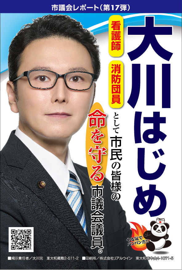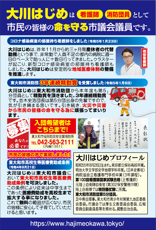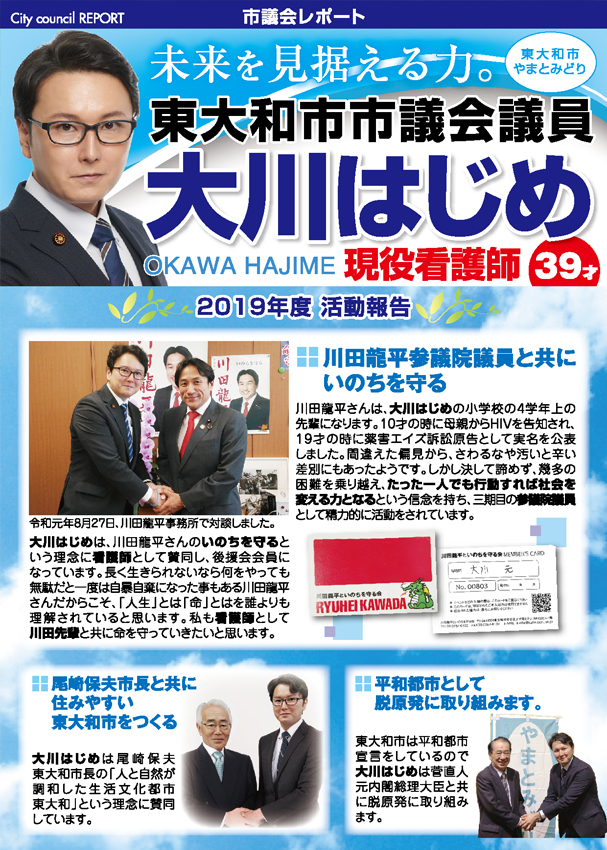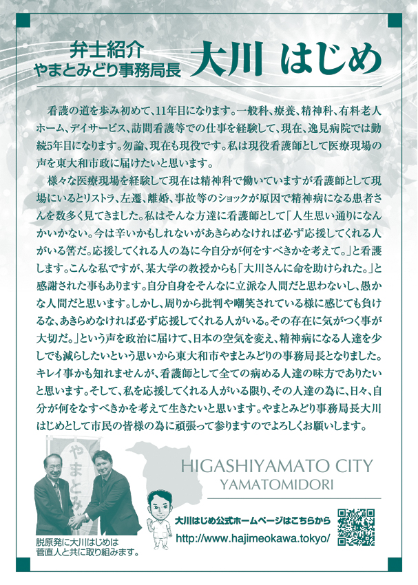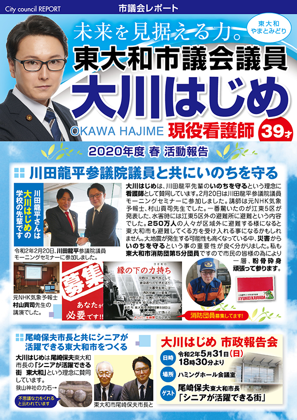 「医療・福祉の専門家として現場の声を市政に届ける」と市民の皆様に訴えて当選させて頂きました大川はじめです。常、日頃におきます皆様の温かいご支援に厚く御礼申し上げます。