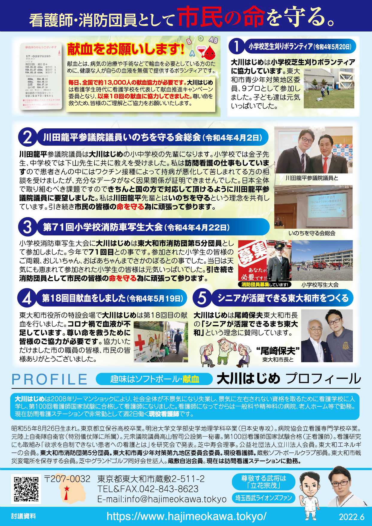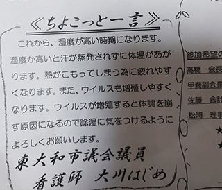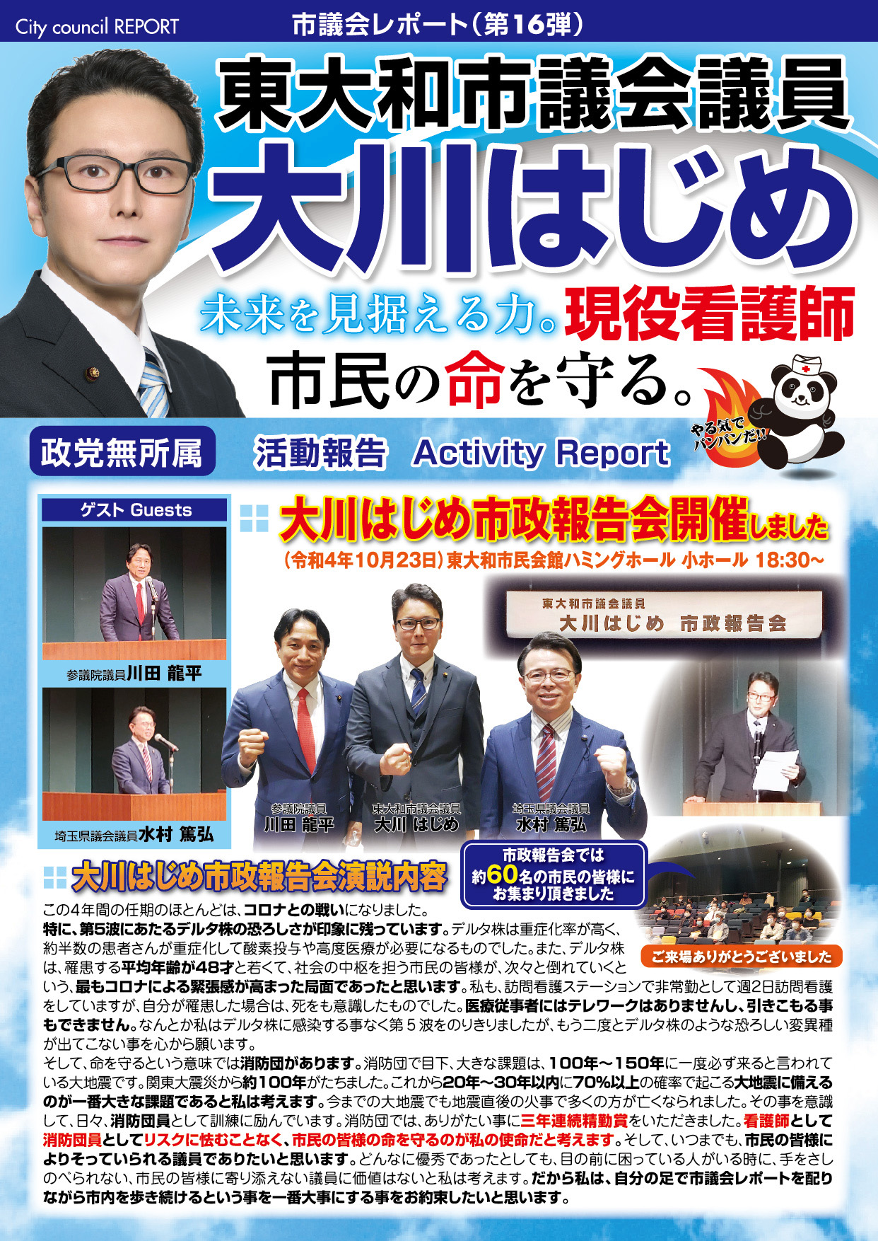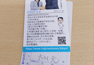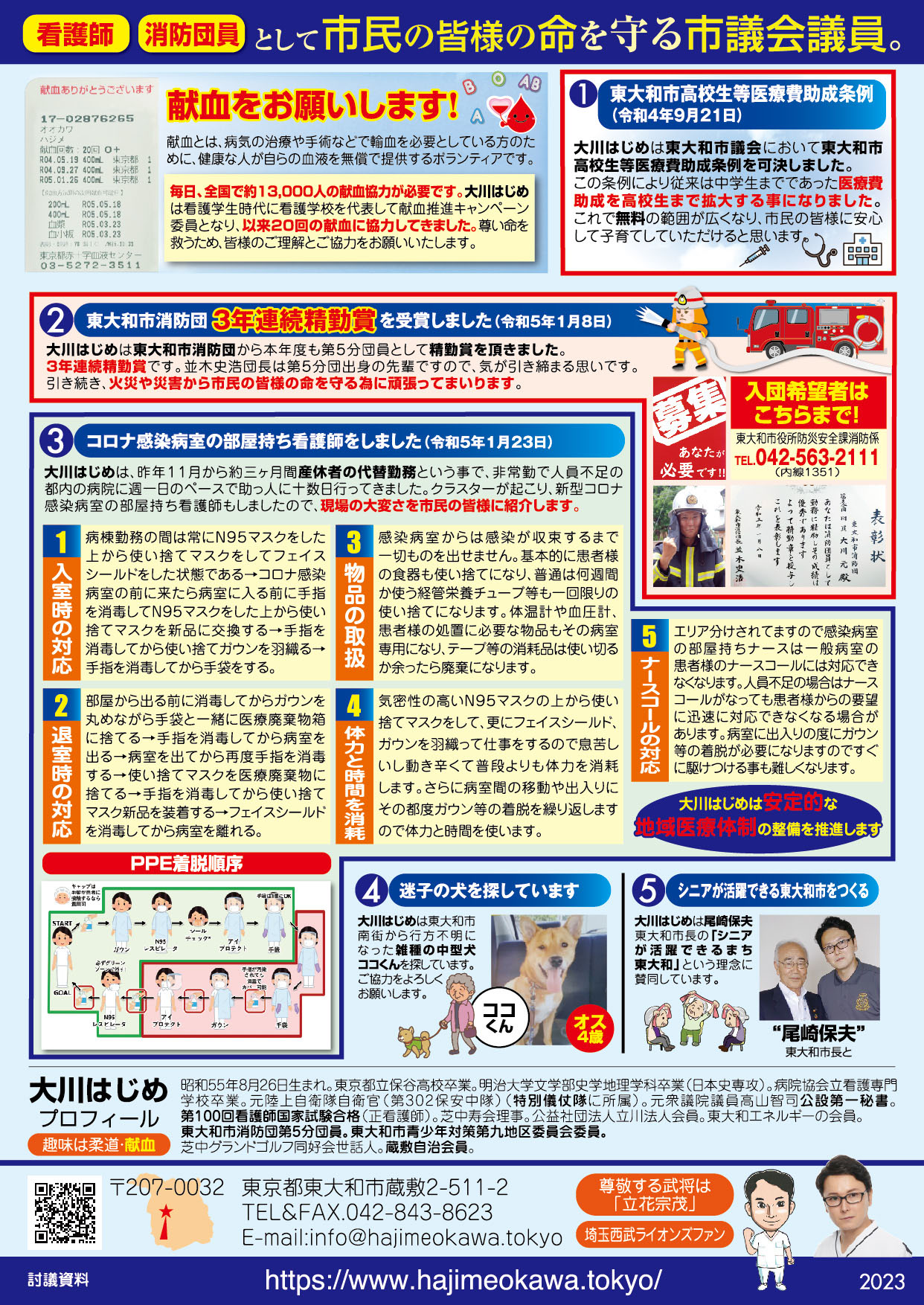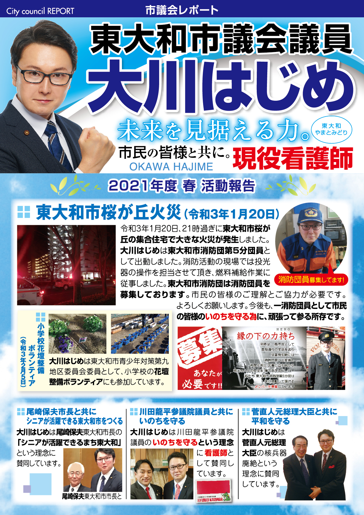 「医療・福祉の専門家として現場の声を市政に届ける」と市民の皆様に訴えて当選させて頂きました大川はじめです。常、日頃におきます皆様の温かいご支援に厚く御礼申し上げます。