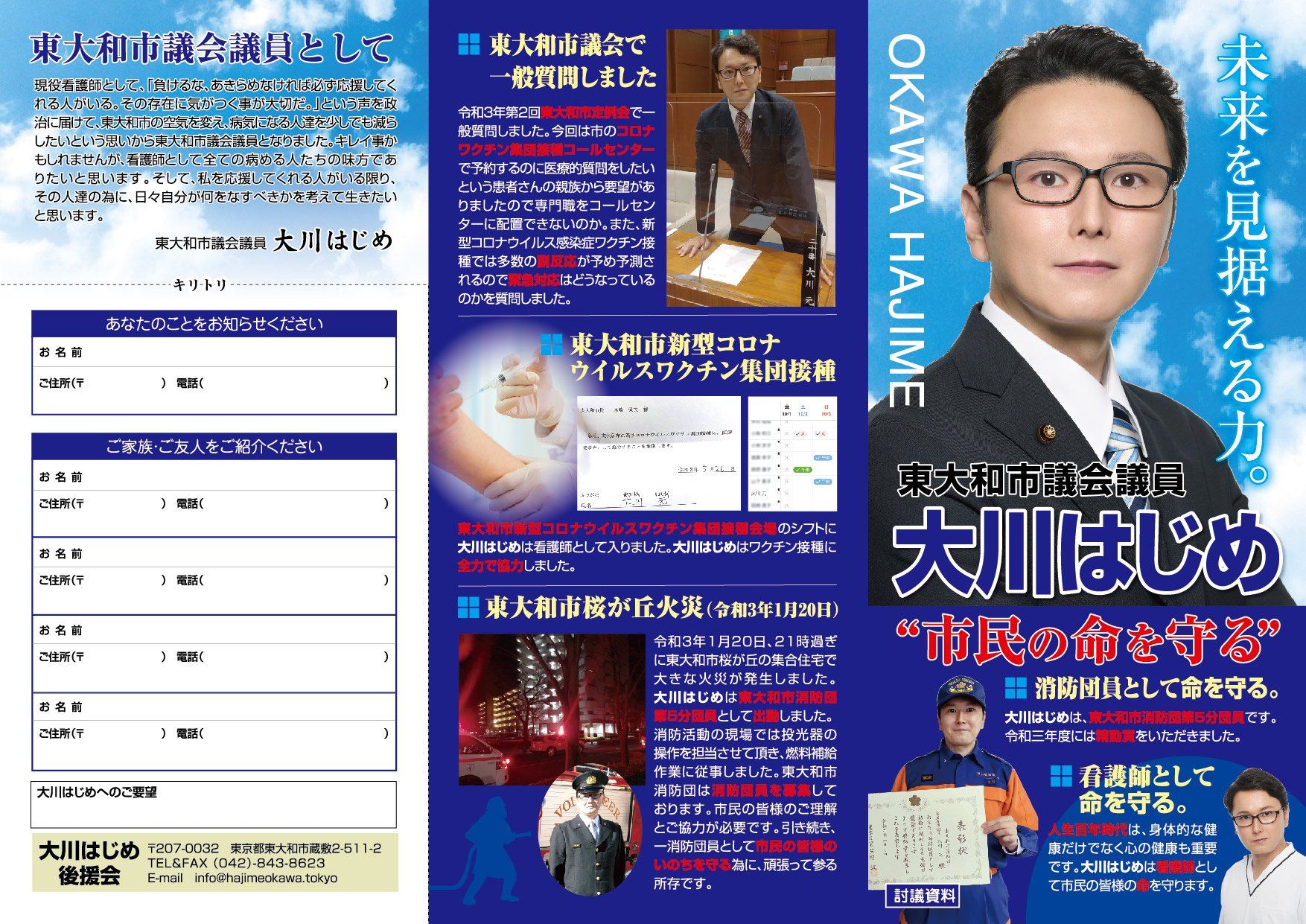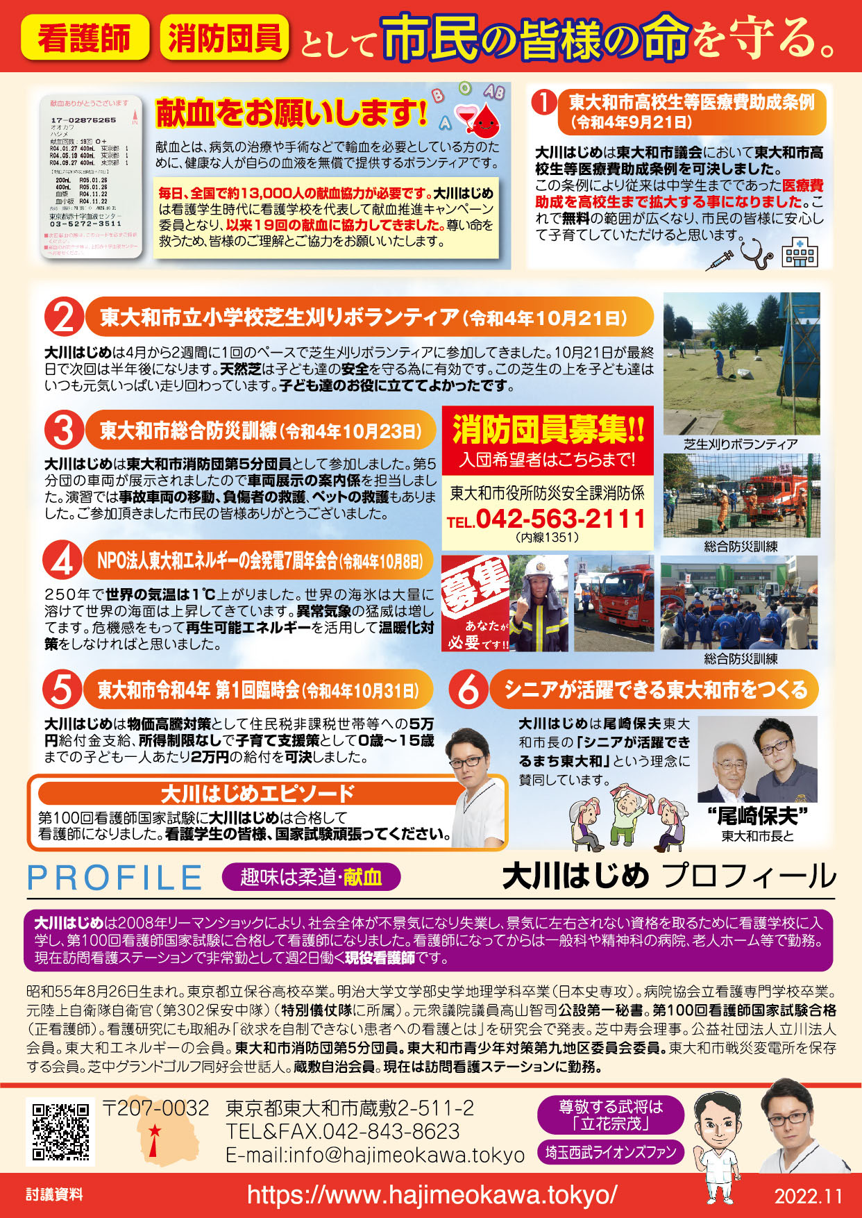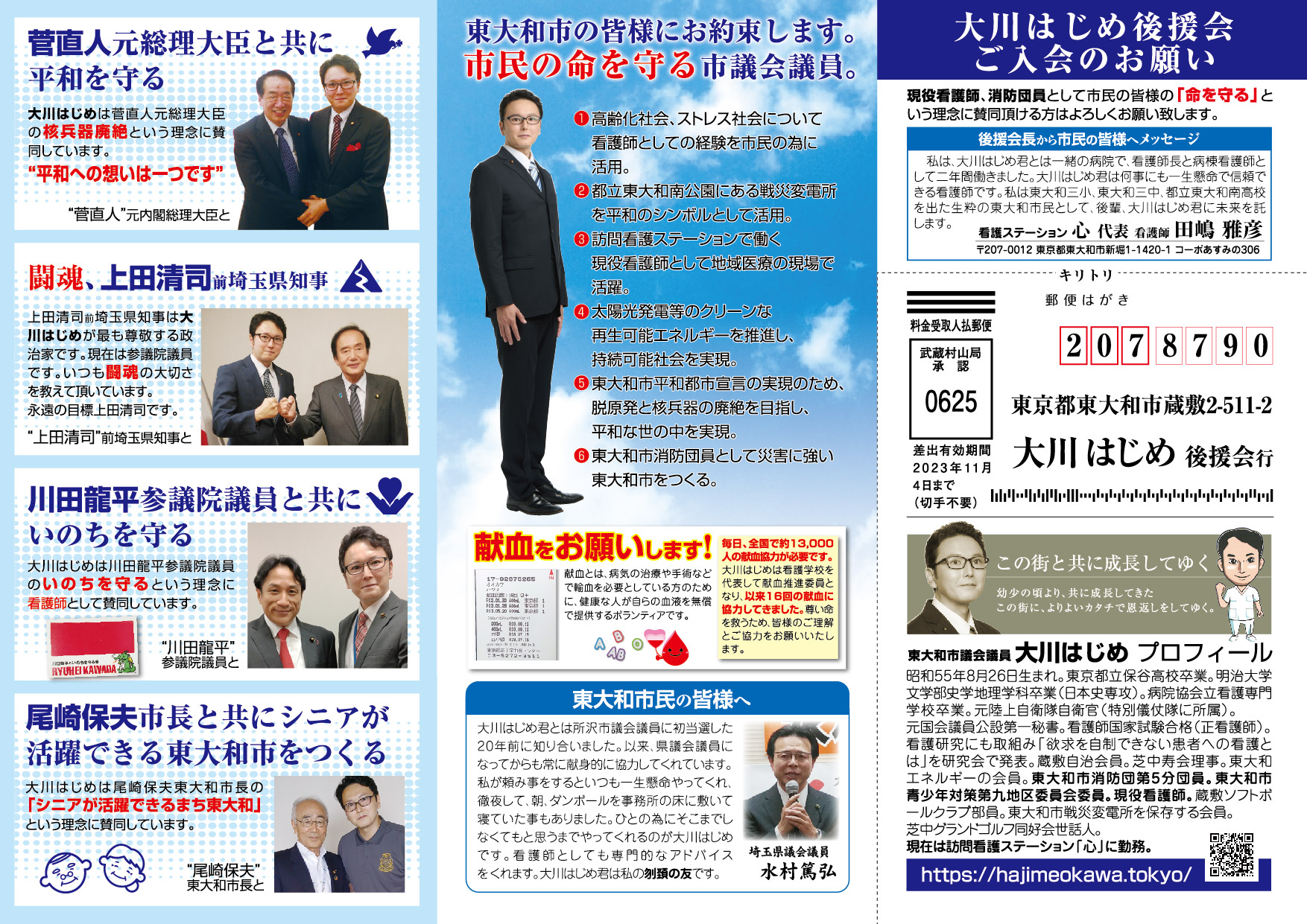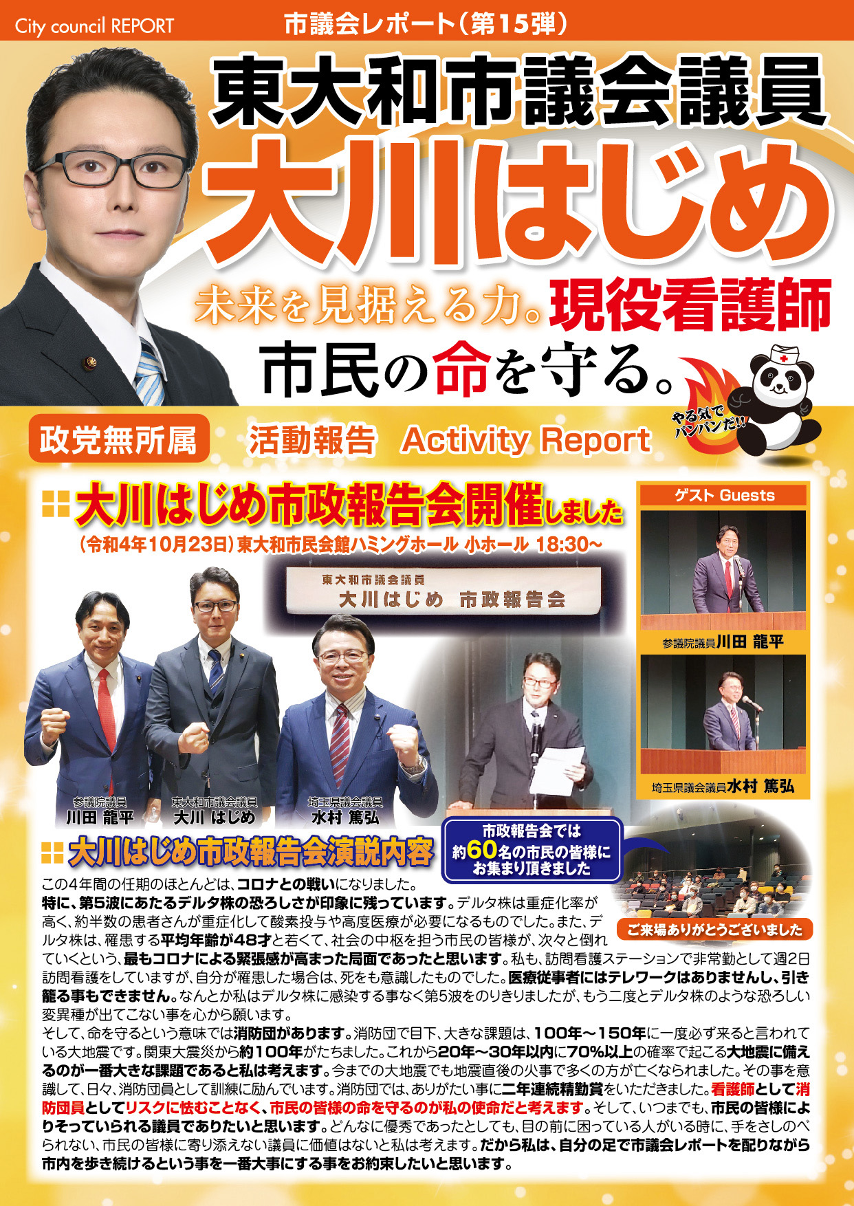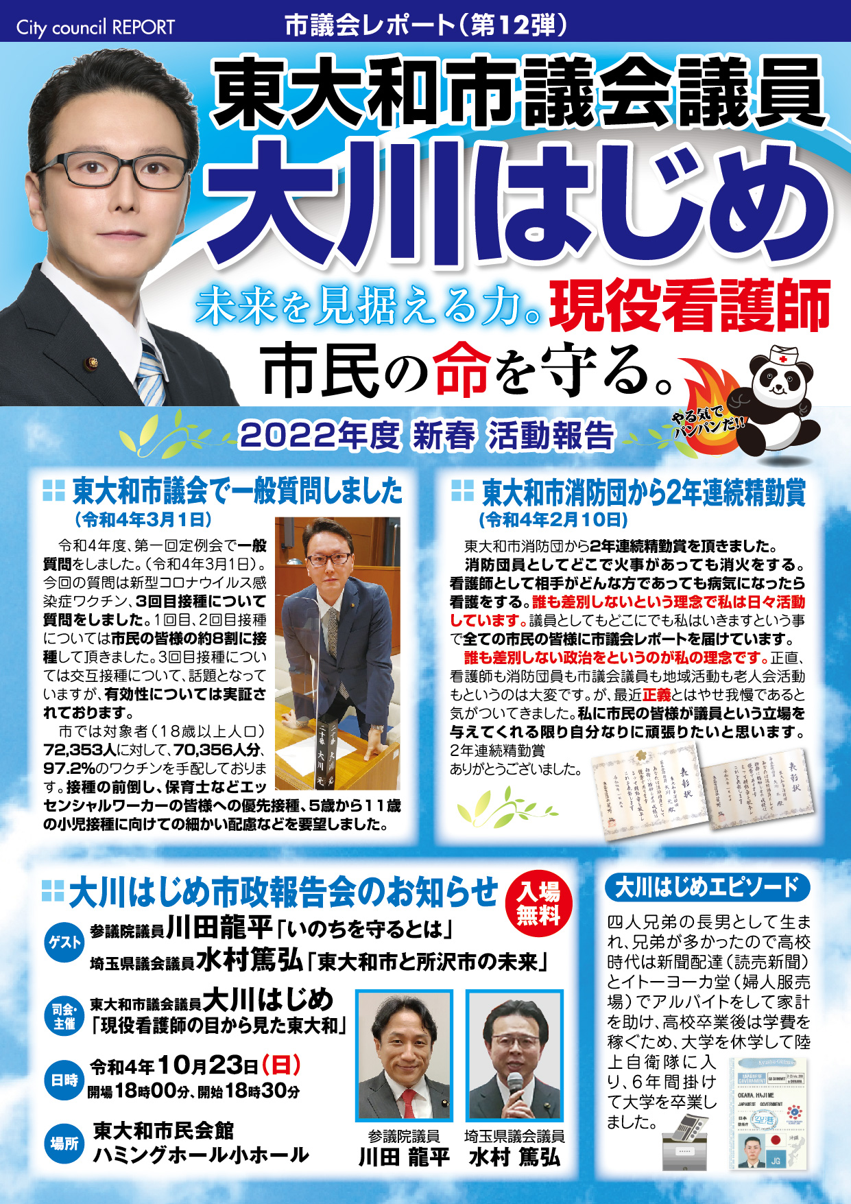 「医療・福祉の専門家として現場の声を市政に届ける」と市民の皆様に訴えて当選させて頂きました大川はじめです。常、日頃におきます皆様の温かいご支援に厚く御礼申し上げます。