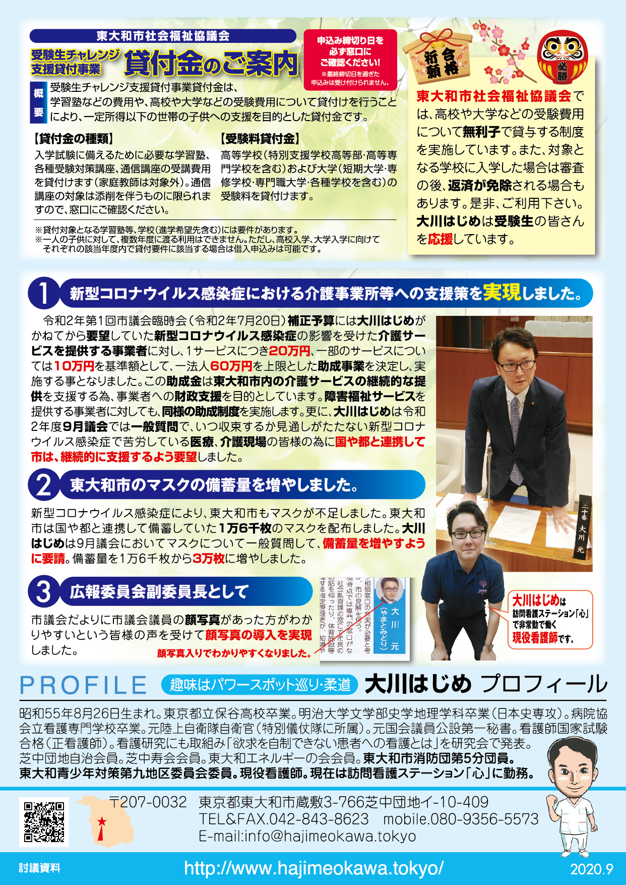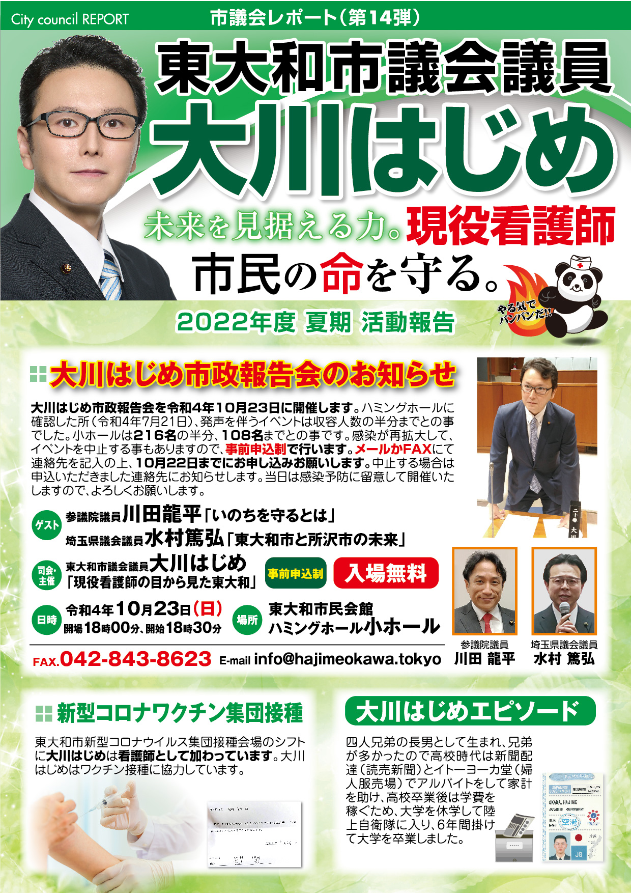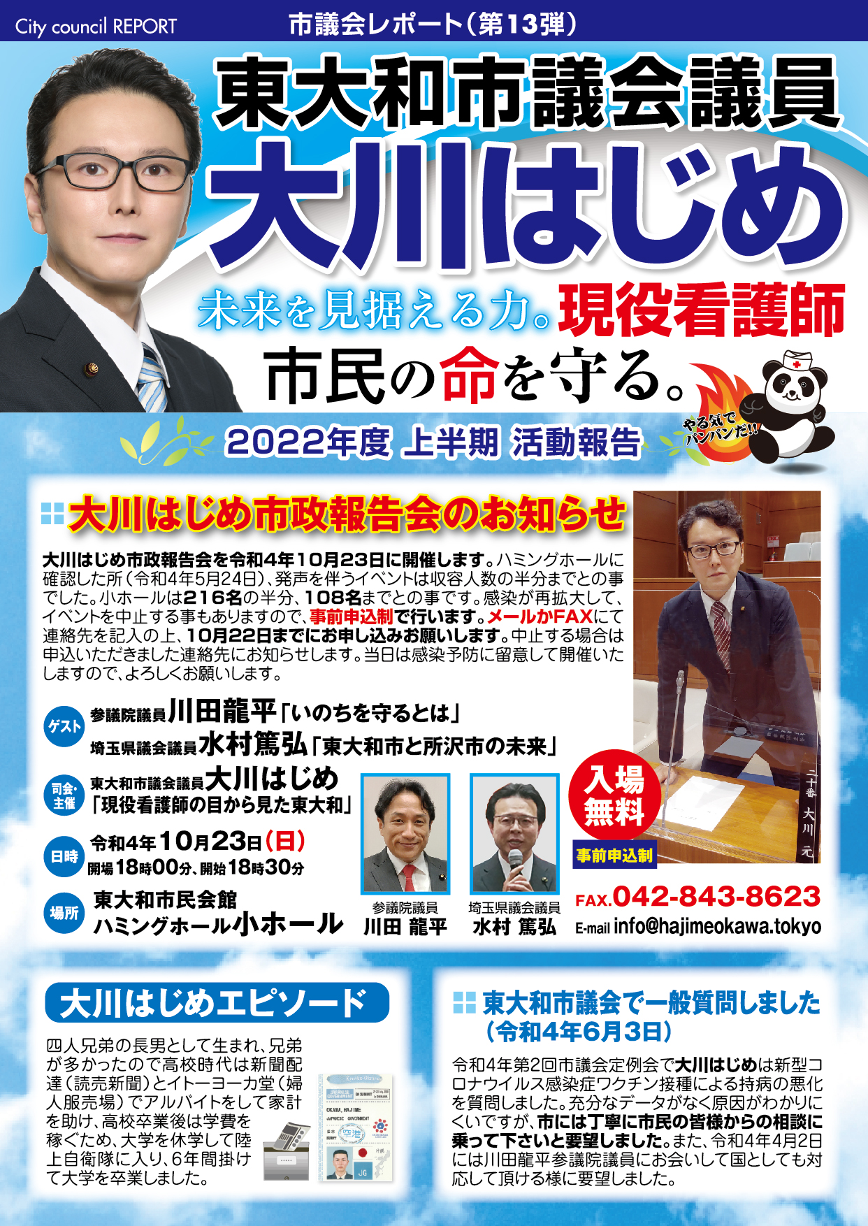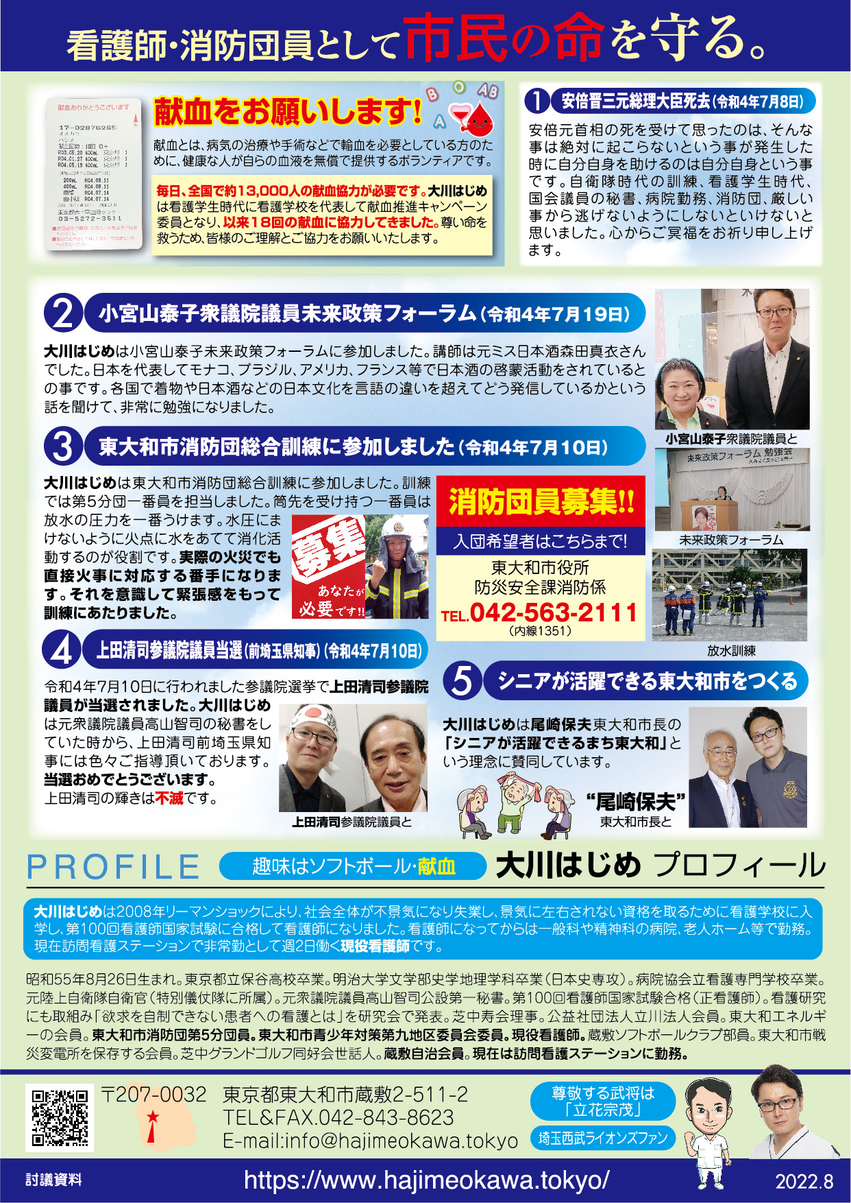 「医療・福祉の専門家として現場の声を市政に届ける」と市民の皆様に訴えて当選させて頂きました大川はじめです。常、日頃におきます皆様の温かいご支援に厚く御礼申し上げます。