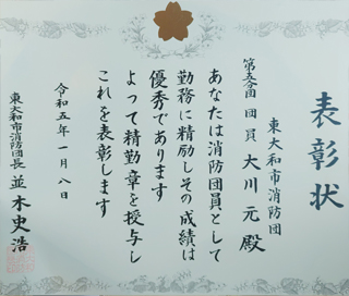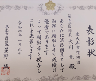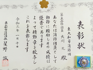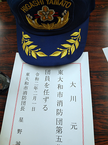 東大和市消防団第5分団の団員になりました。消防団は地域の防災の要です。市民の皆様の為に精一杯頑張ります。よろしくお願いします。