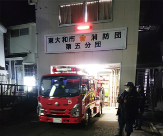 出火報がありましたので消防団員として出場しました。市内の北西方面の出火報でした。蔵敷地域見守り安全隊のパトロールがちょうど終わって解散したばかりのタイミングでしたので市役所に戻らず、第九小学校正門から第5分団詰め所までダッシュで駆けつけました。一班、二班の両班長に大川はじめの三名で火災出場準備をしました。準備完了して出場命令を待ってましたが幸い誤報と判明しました。火災の事実がなくてよかったです。引き続き備えよ常にを意識して消防団員として頑張ってまいります。東大和市消防団の皆様、市民の皆様ありがとうございました。