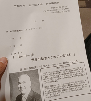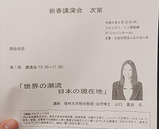 立川法人会新春講演会に立川法人会の会員として出席しました。消防団の先輩の金野さんと待ち合わせして昭島のフォレスト・イン昭和館に車で向かいました。無事、講演会の時間に間に合いました。講師は山口真由さんでした。山口真由さんは東京大学卒業の弁護士、財務省官僚、ハーバード大学に留学されていた経験もあり、テレビとかでも活躍されてます。タイトルは世界の潮流日本の現在地でした。財務省の官僚時代の話、家族型組織のメリット、デメリットについての部分では大川はじめの特別儀仗隊時代を思い出しました。当時は大川はじめも個性を発揮しにくいと感じてましたが、現在になるとよかった点も多々あり特別儀仗隊で鍛えていただけた事にはこころから感謝しております。自己犠牲の先に自分自身の成長があるという事は大川はじめも若い頃には中々理解できませんでした。時代の変化についていけてるかは自分自身にはわかりません。勇気をもって自分が変わる決断、自分自身のアップデートをどうしていくか非常に勉強になりました。立川法人会の皆様、市民の皆様ありがとうございました。