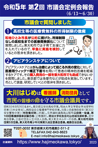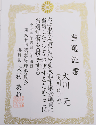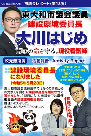 高校生等までの医療費完全無償化の予算案、東大和市子どもの医療費助成に関する条例が東大和市議会で可決しました。和地ひとみ市長と大川はじめの公約が実現しました。大川はじめは東大和市長選挙で和地ひとみ市長を応援しました。公約が実現してよかったです。大川はじめと和地ひとみ市長は「未来につながる市政」という理念を共有しております。引き続き和地ひとみ市長とともに未来につながる市政の実現に向けて頑張ってまいります。市民の皆様ありがとうございました。