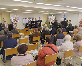 約60名が参加された寿会会場の皆様から芝中団地の為にも頑張って欲しいと激励を多数頂きました。皆様からの期待に応えられる様に頑張ります。