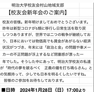 明治大学校友会村山地域支部役員会に副幹事長として出席しました。役員会では4月27日の支部総会について、早稲田大学OB稲門会との合同花見について、支部会則について等を話し合いました。能登半島地震の義援金として一万円を村山地域支部で寄付した報告もありました。明治大学校友会の皆様にはいつも大変お世話になっております。大川はじめが支部総会で司会をする事も決定いたしました。明治大学校友会の役員、副幹事長として引き続き頑張ってまいります。ありがとうございました。