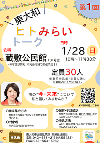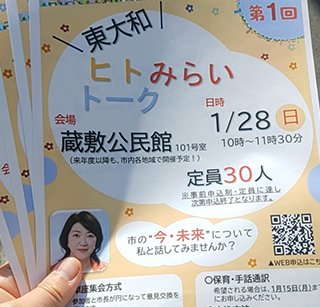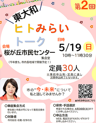 第2回ヒトみらいトークが5月19日午前10時に桜ヶ丘市民センターで開催されます。大川はじめは和地ひとみ市長と「未来につながる市政」という理念を共有しております。車座形式で議論しやすい環境で和地ひとみ市長と話ができるイベントになります。市民の皆様よろしくお願いします。