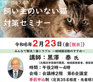 第6回東大和市飼い主のいない猫対策セミナーに東大和市議会建設環境委員会委員長として出席しました。東大和市役所環境課が主催になりますので建設環境委員会の所管になります。飼い主のいない猫の問題は猫を好きな人、猫で困っている人、猫に関心のない人みんなが地域の問題であると共通認識を持つことが大切だとの事でした。東大和市では飼い主のいない猫の不妊去勢手術助成金を実施しております。講師は獣医師の黒澤泰先生でした。市民の皆様ありがとうございました。