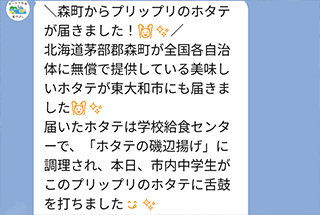 北海道茅部郡森町が全国各自治体に無償提供してくれております、美味しいホタテが東大和市にも届きました。届いたホタテは東大和市学校給食センターで磯辺揚げに調理されて市内の全中学校の給食になるとの事です。本日早速給食で出た中学校もあるみたいです。まだの中学校も楽しみにしていてください。ホタテを提供してくれた森町の皆様ありがとうございました。給食センターの皆様、市民の皆様ありがとうございました。
