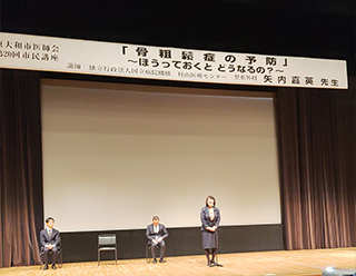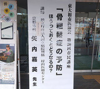 東大和市医師会第20回市民講座「骨粗鬆症の予防」ほうっておくとどうなるの?独立行政法人国立病院機構村山医療センター整形外科矢内嘉英先生講演に市議会議員としてよりも看護師として出席しました。和地ひとみ市長からも骨を大切にして市民の皆様には健康を維持して長生きしてくださいと挨拶がありました。矢内医師からは骨は体を支える、内臓の保護、造血機能、カルシウムの貯蔵庫としての役割がある大切な存在です。また、ビタミンの吸収にも関係する等の講演でした。非常にわかりやすい講演で勉強になりました。東大和市医師会の皆様、市民の皆様ありがとうございました。
