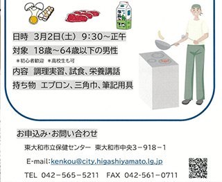 東大和市男性の料理教室の案内をいただきました。男性限定の料理教室であれば気軽に男性でも参加できると思います。いまの時代は男性も料理ができないといけません。大川はじめも申し込み者数に余裕があって時間があれば参加したいと考えます。東大和市立保健センターが主催する料理教室になります。市民の皆様よろしくお願いします。ありがとうございました。