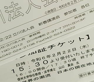 立川法人会新春講演会チケットをいただきました。大川はじめは立川法人会の会員になります。ツイッターでは確定申告ボイコットがトレンドになっておりますが大川はじめは立川法人会の会員ですので先日確定申告してきました。消防団員等をしていますので確定申告をしなければいけません。立川法人会に参加費を事前振り込みいたしましたら参加証が届きました。山口真由さんの講演楽しみにしています。東大法学部を首席で卒業して留学経験もあるとの事です。テレビとかでも活躍されてます。2月22日立川法人会新春講演会をよろしくお願いします。ありがとうございました。