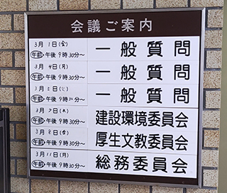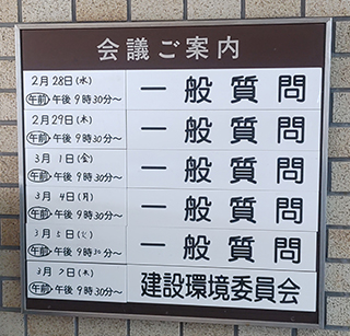 令和6年第1回定例会一般質問初日になりました。大川はじめは9番目に質問ですので、明日一般質問の予定です。今回は@新型コロナウイルス感染症の現時点での総括。A公民館及び市民センターの和室利用について。B上砂一の橋、市道第220号線連結部の経年劣化について。C空堀川旧河川部の緑道への公衆便所や街灯の設置について。D能登半島地震発生による第七小学校・第九小学校統合新校の建築資材等に与える影響について。E年齢枠や試験内容を見直した職員採用試験の内容について。の6項目を一般質問させていただく予定です。これから新興感染症が発生した場合に臨機応変に対応できるようにしていく。公民館の利用率をあげる。事故を防ぎ利用しやすい緑道をつくる。公共施設の建て直しにおける建築資材等の高騰に対応していく。東大和市の有為な人材確保について等、重要な課題を取り上げさせていただきました。関係者の皆様、市民の皆様ありがとうございました。