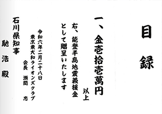 東京東大和ライオンズクラブで能登半島地震義援金を石川県東京事務所に瀬間会長がお届けされたとの事です。大川はじめは東京東大和ライオンズクラブの会員です。総額11万円になり目録をいただきました。瀬間会長はじめお三方には東京東大和ライオンズクラブを代表して訪問いただきありがとうございました。引き続きライオンズクラブの会員として社会奉仕の精神をもって活動してまいります。義援金活動にご協力いただきました皆様ありがとうございました。