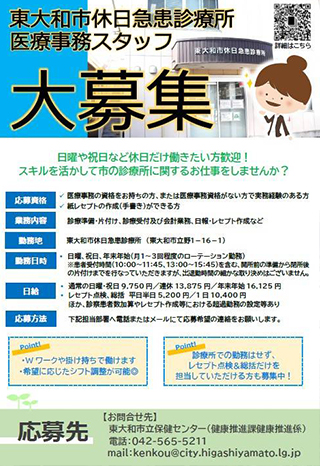 東大和市休日診療所医療事務スタッフを募集しております。Wワークも可能ですので興味がありましたら東大和市健康推進課までお問い合わせください。大川はじめは現在も市民の皆様の健康相談等にのる現役看護師です。市民の皆様よろしくお願いします。ありがとうございました。