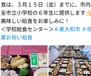 学校卒業お祝い給食が本日から3月15日までに東大和市内の全小学校で提供されます。小学校6年生の皆様楽しみにしていてください。小学校、中学校の卒業シーズンになりました。大川はじめも市議会議員として地元小学校、中学校の卒業式に出席させていただきます。本日も小学生の皆様から東大和市の未来は明るいと希望をいただきました。ありがとうございました。