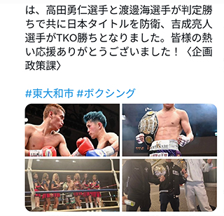市内のライオンズボクシングジムに所属される高田勇仁選手と渡邊海選手が日本チャンピオンを防衛されたとの事です。吉成亮太選手も勝利おめでとうございます。引き続き防衛記録を更新、世界チャンピオンを目指してください。市民の皆様の熱い応援ありがとうございました。