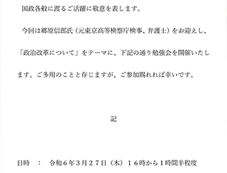 裏金問題についての勉強会に上田清司参議院議員からお招きを受けて参加させていただきました。衆議院議員第一議員会館地下1階の会場設営から通行証を参加者に渡す係もしました。勉強会では元検事の視点から講師の先生からコンプライアンスについての観点から裏金問題について解説いただきました。法律的にみると非常に国民目線からはかけ離れた結論になる事がわかりました。が、その説明には大川はじめとしても納得はできません。国民の皆様が納得いくような結論の法改正が必要だというのがわかりました。現行法では本人が潔く自分自身が裏金だと認めなければ法律的には裁けません。岸田総理には国民が納得いく方向性でこの問題を解決する事を期待したいと考えます。非常に勉強になりました。関係者の皆様、上田清司参議院議員ありがとうございました。