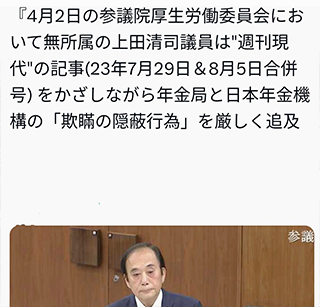上田清司参議院議員が国会で年金局と日本年金機構の情報漏洩を追及しました。委託先が再委託していたのが中国の企業だったという話です。委託先がどこに再委託するかくらいはきちんと委託元が把握しなければ情報漏洩は防げません。また、委託先はこうなっても何も責任をとりません。おかしいと思います。この質問については上田清司参議院議員が正しいと大川はじめも考えます。きちんと年金局と日本年金機構には責任がとれるように国民の個人情報を扱うようにしてもらいたいです。信用が低下するような事はいかんと上田清司は怒ってましたが大川はじめも同感です。よろしくお願い致します。