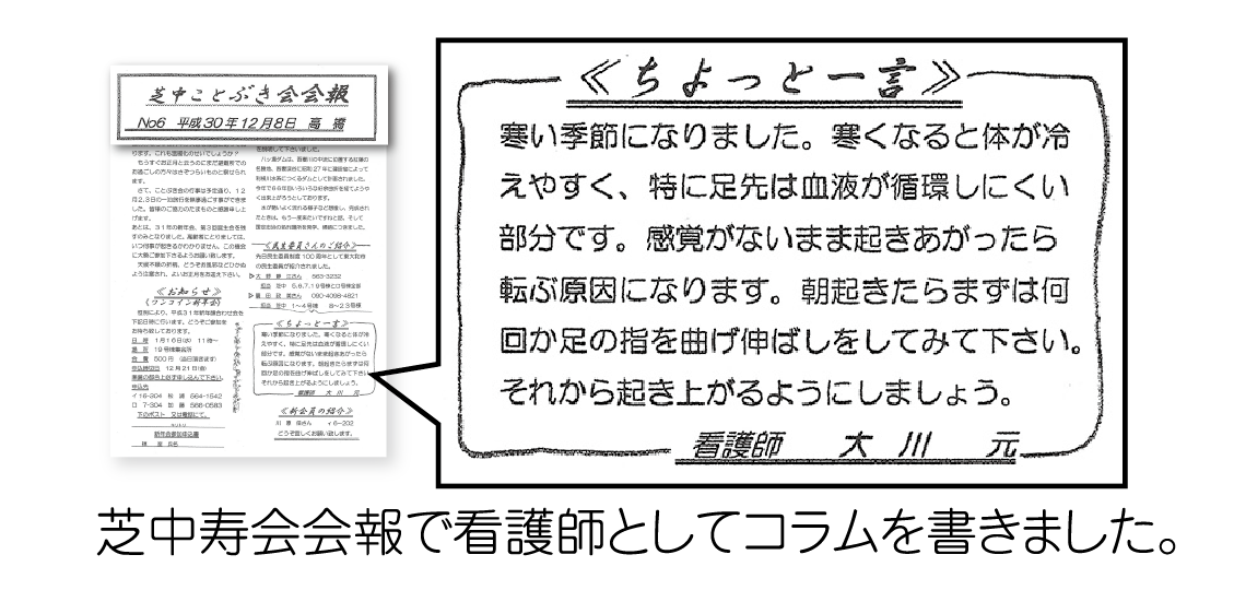 芝中寿会の一泊二日の温泉旅行に看護師としてご一緒させて頂きました。バスの車内では皆様の人生経験豊かなお話しを聴かせて頂き大変勉強になりました。夜の宴会も盛り上がり楽しい時間が過ごせました。芝中寿会の皆様にはいつも大川はじめに温かい励ましを頂きまして本当にありがとうございます。今後も少しでも皆様のお役にたてる様に頑張って参ります。