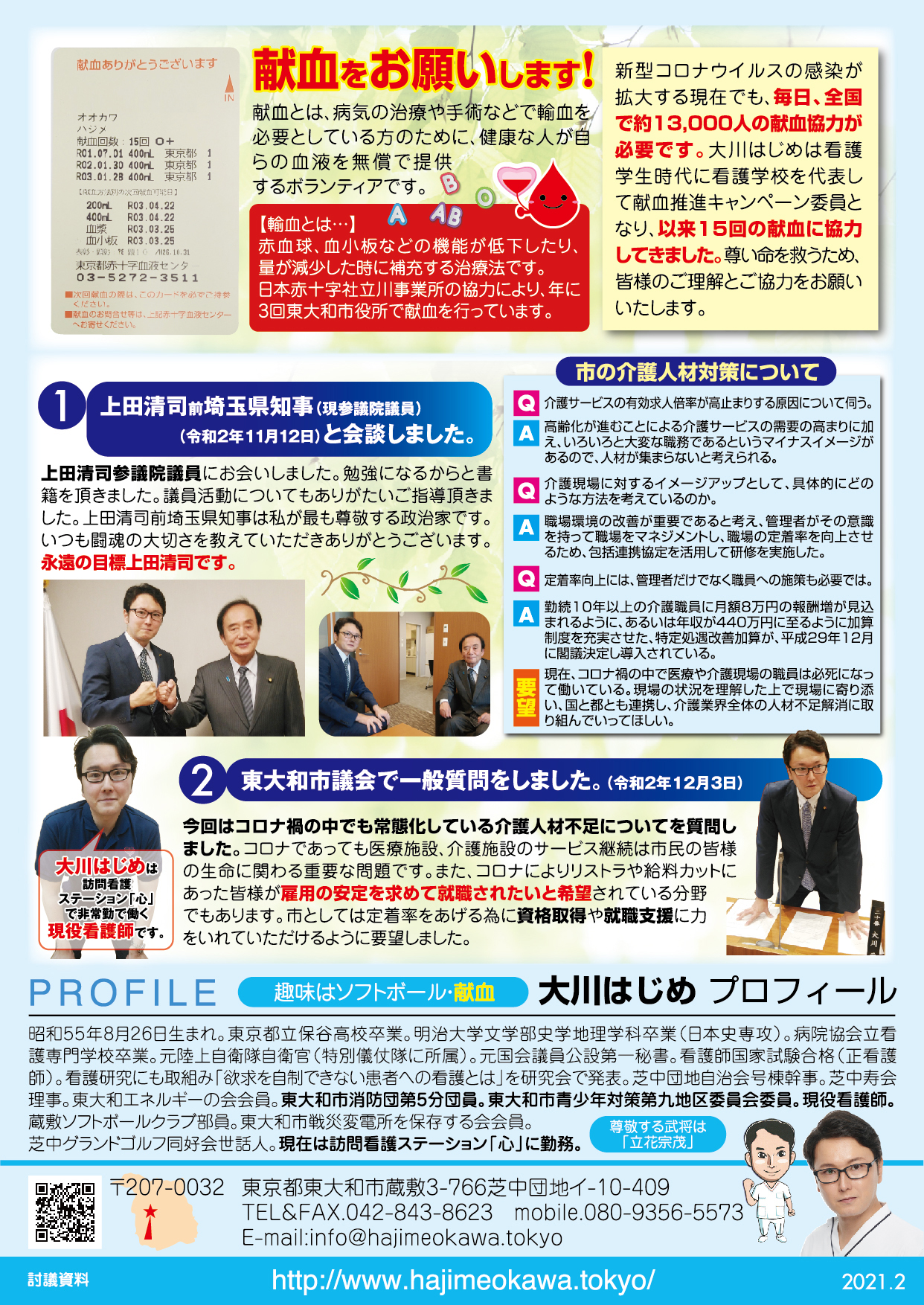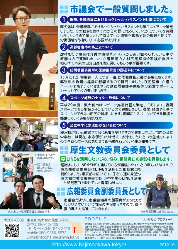 国は医療・介護現場における人員不足を受けて労働環境の改善に力を入れております。東大和市も国の動向を受けてしっかりと取り組んでいく様に要望しました。品川区の介護施設における事件みたいな悲劇を起こしてはいけません。介護人材不足を解消して虐待を防止し、施設で暮らす市民の皆様の安全を私は守って参ります。医療・福祉の専門家として市民の皆様の必ずやお役に立ちます。何かお困りの事がありましたらご相談ください。