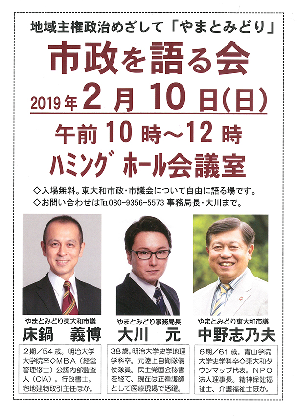 4月27日明治大学校友会村山地域支部総会で実施する講演会で、東大和市出前講座多摩湖塾で東大和市の環境について講演する事が決定しましたので担当課と打ち合わせいたしました。東大和市の環境についてでは湖畔にある二ツ池のかいぼりをテーマに講演していただきます。市民の皆様に東大和市の施策を理解していただく目的で東大和市は出前講座を実施しております。明治大学校友会村山地域支部総会、講演会では司会を担当しますが大川はじめも楽しみにしております。明治大学校友会の皆様、市民の皆様ありがとうございました。